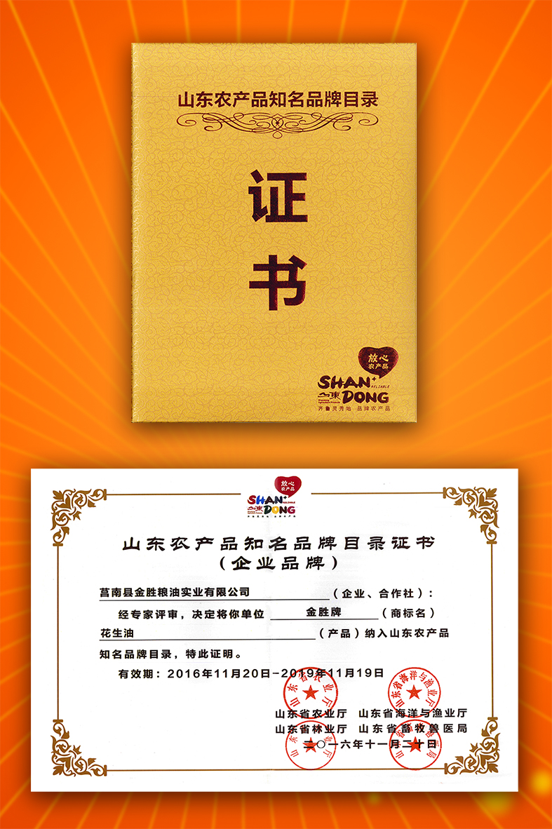 近日,由省农业厅、省海洋与渔业厅、省林业厅、省畜牧兽医局联合评选公布了山东省首批知名农产品企业产品品牌,金胜花生油荣登榜单第九位。